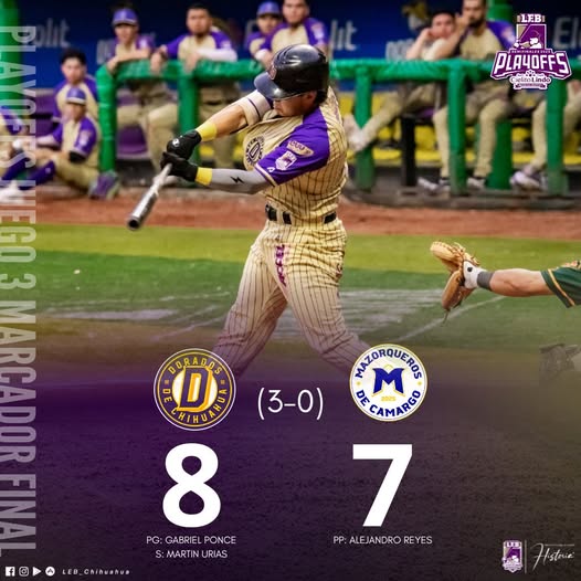 Martín Urías llegó del bullpen en la novena entrada, a tirar cinco strikes consecutivos, con la casa llena y un solo out, para apagarla rebelión local, guiando a los Dorados de Chihuahua a un triunfo de 8-7 sobre los Mazorqueros de Camargo, al reanudarse este viernes las semifinales de la LEB 2025.