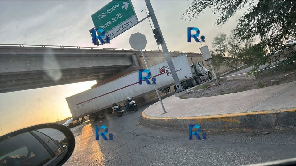 Un tráiler quedó atorado la mañana de este lunes bajo el puente ubicado en el cruce del bulevar Juan Pablo II y Arizona, luego de que el conductor calculó mal la maniobra de vuelta.