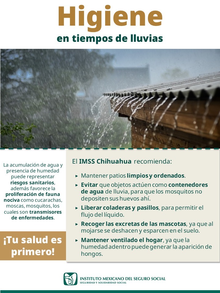 Con el objetivo de evitar enfermedades ante la reciente presencia de lluvias en el estado, el Instituto Mexicano del Seguro Social (IMSS) en Chihuahua recomienda a la población poner en práctica acciones de higiene en los hogares, pues bajo ciertas condiciones, la acumulación de agua y presencia de humedad pueden representar riesgos sanitarios.