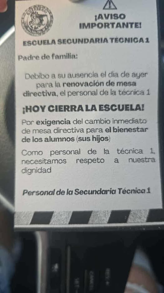 Padres de familia de la Secundaria Técnica 1 denunciaron que este martes fueron sorprendidos con un aviso colocado en la puerta del plantel que anunciaba el cierre de la escuela, lo que ocasionó que alumnos de segundo y tercer grado fueran regresados a sus casas sin previo aviso.