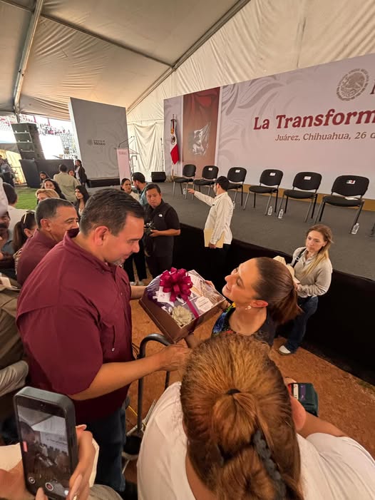 Tras el informe presentado esta tarde en Ciudad Juárez, el Presidente Municipal, Cruz Pérez Cuéllar, entregó a la presidenta de México, Claudia Sheinbaum Pardo, un conjunto de regalos elaborados por mujeres indígenas de la ciudad