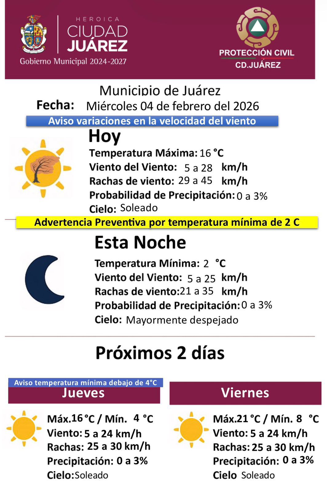 La Dirección General de Protección Civil informó que este miércoles 4 de febrero se mantiene un aviso por variaciones en la velocidad del viento, así como una advertencia preventiva por temperatura mínima para el municipio de Juárez.