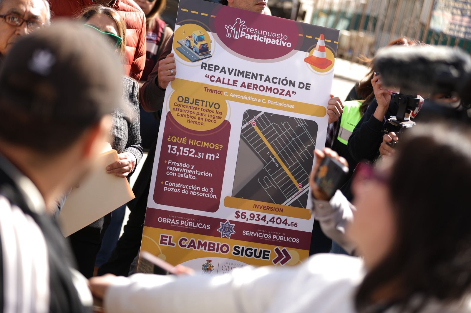 El Presidente Municipal, Cruz Pérez Cuéllar, encabezó la entrega de la repavimentación de la calle Aeromoza, obra realizada con recursos del Presupuesto Participativo para fortalecer la movilidad y seguridad en el sector. El proyecto abarcó una superficie de 13 mil 152.31 metros cuadrados, con una inversión de 6 millones 934,404.66 pesos.