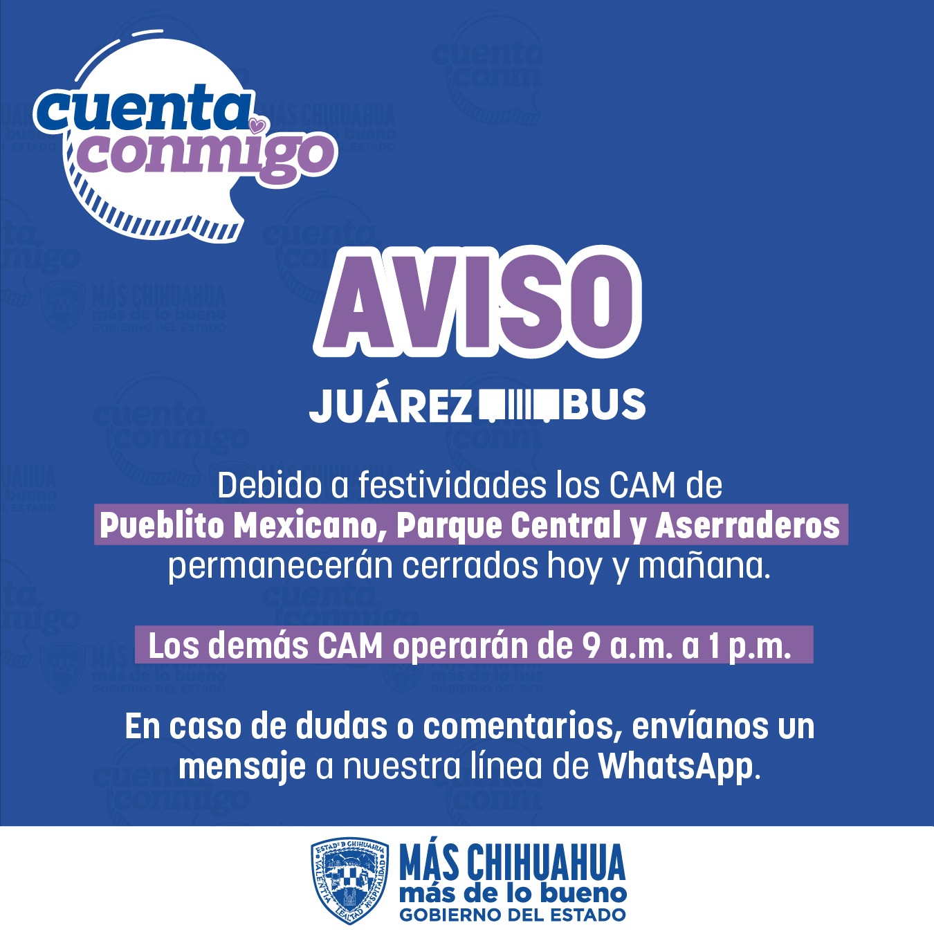 Para dudas o comentarios, enviar un mensaje a la línea de WhatsApp al (656) 852 73-84.