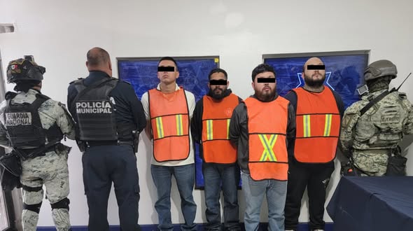 Agentes de la Secretaría de Seguridad Pública Municipal en coordinación con elementos de la Guardia Nacional y del Ejército Mexicano, arrestaron a Leonardo Ángel E. L., Pedro David O. S., Mario E. L. y Luis Alfredo R. R., por su presunta responsabilidad en la comisión de delitos contra la ley federal de armas de fuego y explosivos.