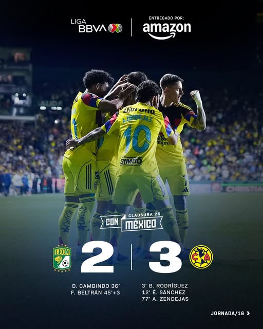 Vuelan a Liguilla. Por segundo partido consecutivo, América ganó y virtualmente está clasificado a la Fase Final del Clausura 2026. Con goles de Brian Rodríguez, Alejandro Zendejas y Erick Sánchez, las Águilas derrotaron 2-3 a León y sumaron tres puntos importantes en la lucha por llegar a la Liguilla. Con 25 puntos y en sexto lugar, luego de estas dos victorias seguidas los dirigidos por André Jardine estarán nuevamente dentro de los ocho mejores.