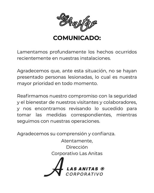 A través de un comunicado en sus redes sociales, el centro recreativo Las Anitas se pronunció sobre el incendio registrado anoche en sus instalaciones entre Ramón Rayón y Juan Pablo II. El corporativo indicó que en el incidente no se reportaron personas lesionadas, lo cual, acotó, es lo importante.