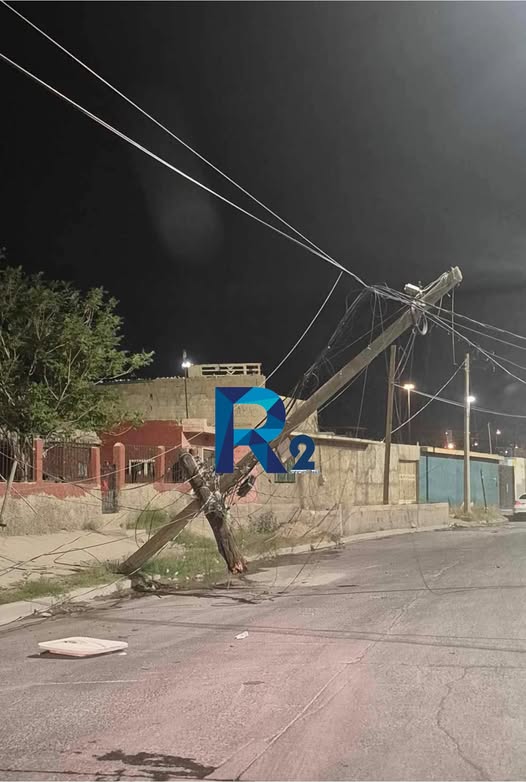 Dos postes que sostienen cables de energía eléctrica fueron dañados por un choque y se encuentran suspendidos sobre el arroyo De las Víboras y la calle Ocotillo de la colonia Felipe Ángeles.